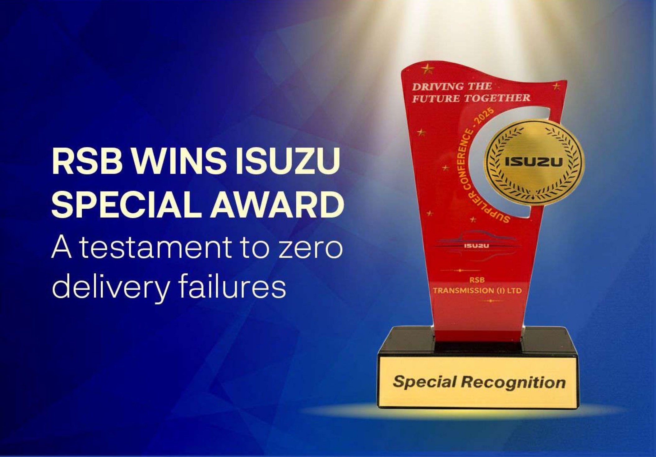 RSB won the Special Category Award from ISUZU for unwavering commitment to excellence and zero delivery failures; Mr. M. Sankarnarayanan, Mr. Ravi Prasad, and Mr. Pranjal Baruah received this recognition for Team RSB’s customer-centric operations